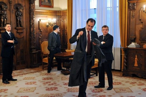 Simor András veszi a kabátját, a háttérben utódja, Matolcsy György