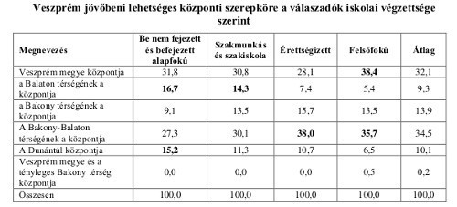A jövőbeni fejlesztésekkel kapcsolatban két markáns irányt lehet felfedezni a válaszokban. Egyik a konzervatív, jól megszokott vélemény, miszerint Veszprém a megye központi szerepét célozza meg. Másik irány már egy új területet vesz célba, miszerint a Bakony és Balaton közelségét felhasználva Veszprém a térség központja legyen.