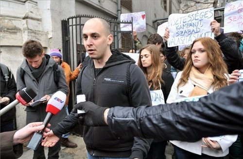 A 20-as éveiben járó fiatalember, aki nevét nem árulta el, arról beszélt az újságíróknak, hogy miközben megpróbált bejutni a székházba, az ajtónyílásba betette a kezét és a lábát. Közlése szerint a bent lévők a lábát rugdosták, a kezére pedig rá akarták zárni az ajtót. Hozzátette: ezután passzívan ellenállt a rendőri intézkedésnek, ezért beszállították a VI. kerületi rendőrkapitányságra. Itt jogszerű rendőri intézkedésnek való ellenszegülés szabálysértése miatt indult ellene eljárás, amiért 30 ezer forintra bírságolták - mondta. Hangsúlyozta, nem ismeri el a szabálysértés tényét, de ha megbüntetik mégis, akkor ledolgozza büntetését.
