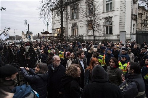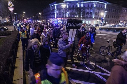 A tüntetők elhagyták a Fidesz budapesti, Lendvay utcai székházának udvarát csütörtök este. A néhány száz demonstráló - rendőri sorfal mellett - a Rippl-Rónai utcán keresztül este fél 9 után az Andrássy útra tért rá. A hangosbeszélőt kezelők egyike előzőleg arra biztatta őket, hogy vonuljanak az Alkotmánybíróság épületéhez. A résztvevők az úttesten, a külső sávban haladnak, azt skandálják, hogy "alkotmányt!, demokráciát, jogállamot!"
