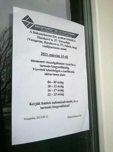 Döbbenten vették tudomásul a Haszkovó 37. társasház lakói a Bakonykarszt Zrt. kedden kihelyezett plakátját a lépcsőházuk ajtaján, ami arról tájékoztatta őket, hogy vízdíjtartozás miatt ütemezett vízszolgáltatást vezetnek be az épületben, amíg a hátralékot nem egyenlítik ki. Ez a gyakorlatban annyit jelent, hogy mindössze napi négyszer egy órát biztosít vízvételi lehetőséget a vállalat, a köztes időszakokban csak levegő érkezik a csapokból.