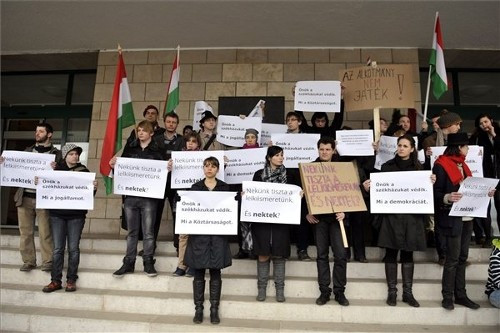 Nem legitim kormány az, amelyik felhatalmazásával visszaélve a hatalom kizárólagos birtoklására törekszik - jelentette ki. Hozzátette: az egyoldalúan megalkotott alaptörvényt nem tartják legitim alkotmánynak, mert "nem az alkotmányosság és az emberi jogok védelmét, hanem a Fidesz-KDNP hatalmi érdekeit, a jogfosztást és a diszkriminációt szolgálja". Hangsúlyozta: Áder János köztársasági elnöktől azt követelik, hogy ne írja alá a jogszabályt. Mellette álló társa, Oláh Kata azt mondta, véleményük szerint nem ők, hanem a kormány követett el jogsértést a demokrácia ellen, mégpedig azzal, hogy "korlátozza minden magyar állampolgár jogait". Kérdésre válaszolva hozzátette, addig fognak tiltakozni, amíg nem valósul meg az alkotmányosság Magyarországon.