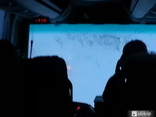 9:15 - A kép még délután készült (2013. 03. 14.), egy Budapestre tartó volánbuszból, ami 15:00 órától (tehát lassan 18 órája) egy helyben áll az ítéletidő kellős közepén a Csákberény és Csákvár közötti útszakaszon az utasaival együtt. A képen látható, hogy a hófúvástól a látótávolság majdhogynem 0 méter! Az ott rekedteknek esélyük sincs menedékhelyet megközelíteniük, a forgalom áll.