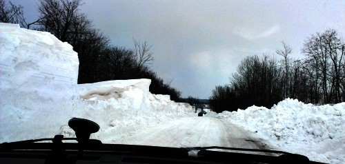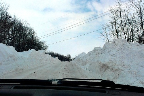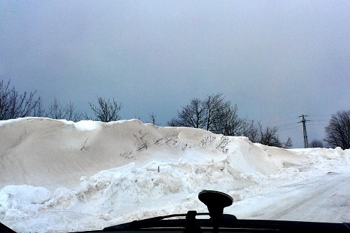 Nagyesztergár és Dudar között csak fél sáv járható, a másik sávot két méter magas hófal fedi, kiszabadításán ottjártunkkor is dolgoztak. A forgalmat polgárőrök irányítják, értelemszerűen egyszerre csak az egyik irányból lehet közlekedni.