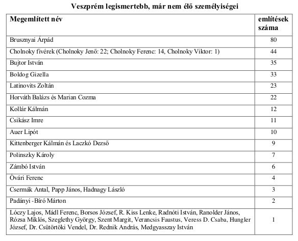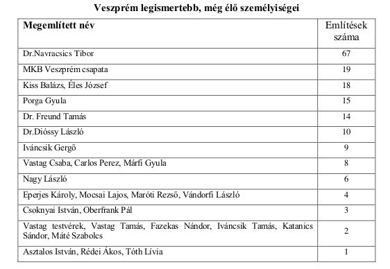 A legismertebb veszprémi kötődésű személyek listáját dr. Navracsics Tibor országgyűlési képviselő, miniszter vezeti óriási fölénnyel. Mögötte találjuk az MKB kézilabdázóit, Kiss Balázs olimpikont, Éles József egykori kézilabdázót és Porga Gyula jelenlegi polgármestert.