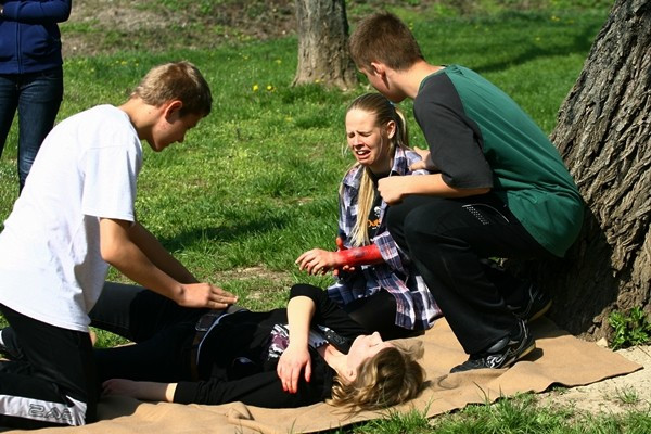 A véres kezű sérültek látványa sem roppantotta meg őket, magabiztosan látták el a fiktív sebeket. Már-már a Riviérát idézte a Séd partján zsákokból kiömlött homok: a gátépítésben még van hova fejlődni annak a csapatnak, akik ottjártunkkor próbálkoztak.