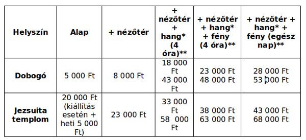 Az előterjesztés az intézmények termeinek bérlését szabályozza. A lényeg – vagyis az árak – az alábbi táblázatban láthatók.
