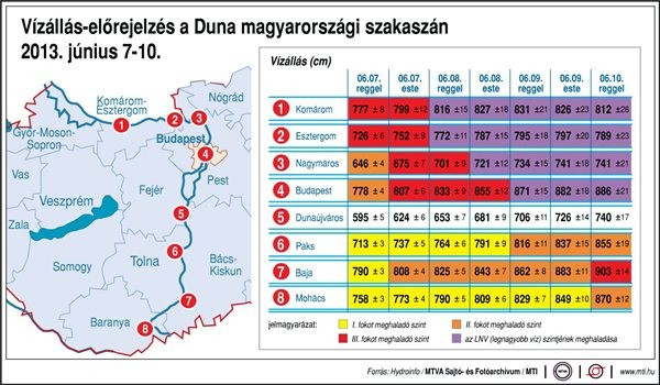 A szükséges források, készletek rendelkezésre állnak, a kivitelezés a tetőzés várható időpontjáig nagy biztonsággal végrehajtható. A délután 2 órás mérések ismét 10 centiméter körüli emelkedést mutattak a Duna vízállásában. Nagybajcsnál 838 centiméteres, Budapestnél 738 centiméteres a folyó magassága. Komáromnál 737, Esztergomnál 680 centiméteren áll a Duna, és már Nagymarosnál is meghaladja a 6 métert (606 centiméter) a vízszint.