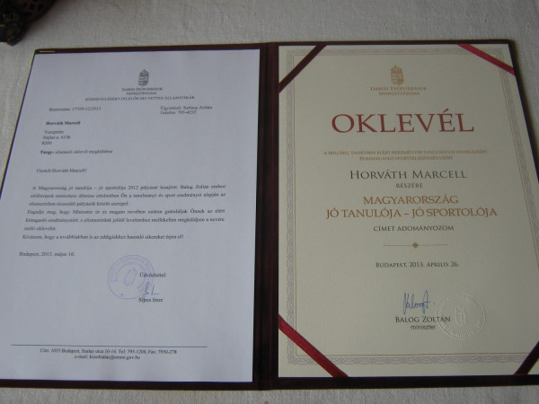 A veszprémi sportoló a tavalyi évben elért eredményes tanulmányi munkájáért és kimagasló sportteljesítményéért ismét megkapta a „Jó tanuló, jó sportoló” elismerést. 2009 és 2010 után harmadik alkalommal érte el – sőt, haladta meg – az előírt követelményeket.