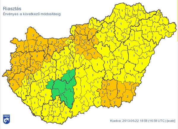 Az Országos Meteorológiai Szolgálat szombat délután az MTI-hez eljuttatott veszélyjelzése szerint a hőség miatt érvényben lévő figyelmeztetések mellett, a heves zivatarok miatt már az egész ország területén narancssárga, vagyis másodfokú figyelmeztetés van érvényben. A kora esti, esti órákban a Dunántúlon, majd később a középső országrészben lehet zivatarokra számítani, amelyek nyomán nagyobb eséllyel alakulhat ki szélroham is, 80-100 kilométer/órát meghaladó lökésekkel, néhol 2-3 centimétert meghaladó jéggel, felhőszakadással.