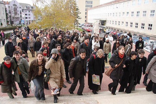 Információnk szerint a dékán az utolsó pillanatokban helyezte át fogadóóráját a B épület dékáni titkárságára, ezért az egyetem N épületénél gyülekező hallgatók közösen vonultak le az alsó kampuszra, hogy ott adják át nyilvánosan a petíciót. A titkárság ügyvivő szakértője, Vajda Gábor azonban közölte, dr. Szilágyi István dékán csak azokat fogadja irodájában, akik időben és személy szerint bejelentkeztek hozzá, így csak Omischl Ferenc szakképviselő, Láng Dániel kari hallgatói önkormányzati képviselő és Lócsi Dóra szakképviselő jutott be. Mi hivatalnokok vagyunk, kérem, tartsák tiszteletben a munkahelyünket! - fordult a helyi televíziók és újságok képviselőihez a szakértő.
