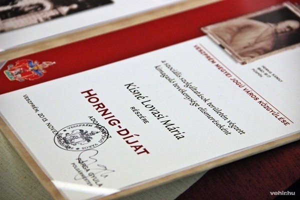 A veszprémi szociális szolgáltatások terén végzett kimagasló munkájáért a Hornig-díjat idén, a VKKT Egyesített Szociális Intézmény nyugdíjba vonuló igazgatója, Kisné Lovasi Mária vehette át.