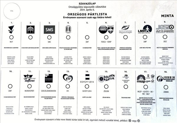 A listán a következő sorrendben szerepelnek a pártlisták: Magyarországi Cigánypárt, A Haza Nem Eladó Mozgalom Párt, Seres Mária Szövetségesei, Független Kisgazda- Földmunkás és Polgári Párt, Új Dimenzió Párt, Fidesz-Magyar Polgári Szövetség-Kereszténydemokrata Néppárt, Sportos és Egészséges Magyarországért Párt, Lehet Más a Politika, Jólét és Szabadság Demokrata Közösség, Új Magyarország Párt, Magyar Munkáspárt, Szociáldemokraták Magyar Polgári Pártja, Közösség a Társadalmi Igazságosságért Néppárt, Együtt 2014 Párt, Zöldek Pártja, Összefogás Párt, Magyar Szocialista Párt-Együtt – A korszakváltók Pártja-Párbeszéd Magyarországért Párt-Demokratikus Koalíció-Magyar Liberális Párt és Jobbik Magyarországért Mozgalom.