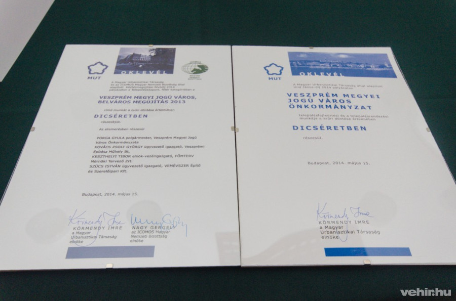 Dicsérő oklevelet vehetett át a veszprémi önkormányzat településfejlesztési és településrendezési munkájáért a Magyar Urbanisztikai Társaság (MUT) által alapított települési Hild János-díj 2014 pályázat eredményeként - ismertette sajtótájékoztató keretében Porga Gyula polgármester.