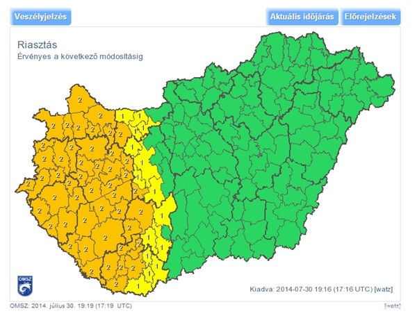 A Veszprémi járásra vonatkozóan az alábbi figyelmeztetés van érvényben: kis valószínűséggel kialakulhat heves zivatar (károkozó szél vagy nagy méretű jég kíséretében), illetve intenzív záporból, zivatarból rövid idő alatt 50 mm-t meghaladó csapadék hullhat.