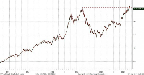 És arra, hogy 300-400 dolláros árfolyamnál megjelentek a vészmadarak? „Ez már nem mehet tovább!!!…nagyon drága…stb”- mondták. Sokat nem tévedtek :-) . De ahogy szokták mondani, a fák nem nőnek az égig, így volt itt is, hiszen a 2012-es csúcs után majdnem a felére esett vissza, 400 alatt is járt – a mai árfolyammal számolva 55 dollár volt az alja, hiszen a cég vezetése júniusban egy 7:1 arányú részvényfeldarabolás mellett döntött. A fák ugyan tényleg nem nőnek az égig – kivéve a paszuly –, de az Apple újra történelmi csúcson jár, legalábbis szeptember 2-án 103 USD fölé merészkedett (721 split előtti dollárban). Feltűnt ez valakinek??? A piac is mintha csak most vette volna észre (szeptember 3-at írunk), jól be is adták, jelenleg 100-nál jár. Mondjuk az is igaz, hogy pár celeb szaftos képe kikerült a netre a meghackelt iCloudból :-)