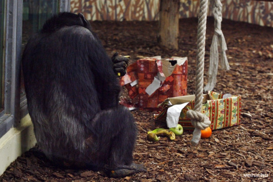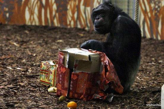 A közönséges csimpánzok Totó, Sony és Maggie nagy izgalommal bontották ki a csomagokat…