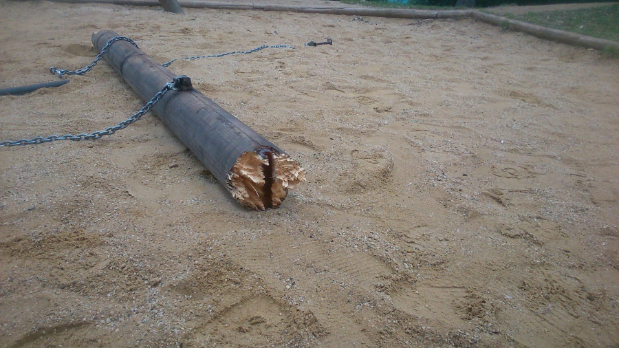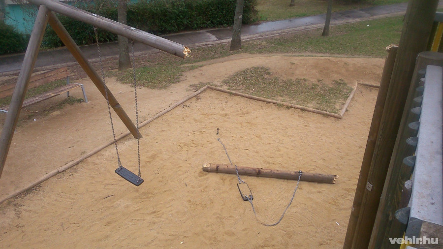 Szintén ide sorolnám a játszóterek rongálását is, amit az egyik veszprémi lakótelepen élők tapasztalhattak. Véletlenül elrontani valamit sem nagy dicsőség, de a képeken látható hinta elég masszívnak tűnik, nehéz elhinni, hogy egy balszerencsés mozdulatnak ilyen eredménye lenne. El kell ismerni, erődemonstrációnak elég hatásos volt a mutatvány. Remélhetőleg az erőművész hamar előkerül, hogy személyesen is bemutatkozhasson a tisztelt publikumnak – ebben a környéken élők jelenthetnek nagy segítséget. Erősen kétlem, hogy senki nem figyelt fel a garázdálkodókra, hiszen a játszótér csak néhány méterre van a lakóépületektől. Valaki csak felébredt a zajra, valaki csak odament az ablakhoz megnézni, mi folyik odakint?!