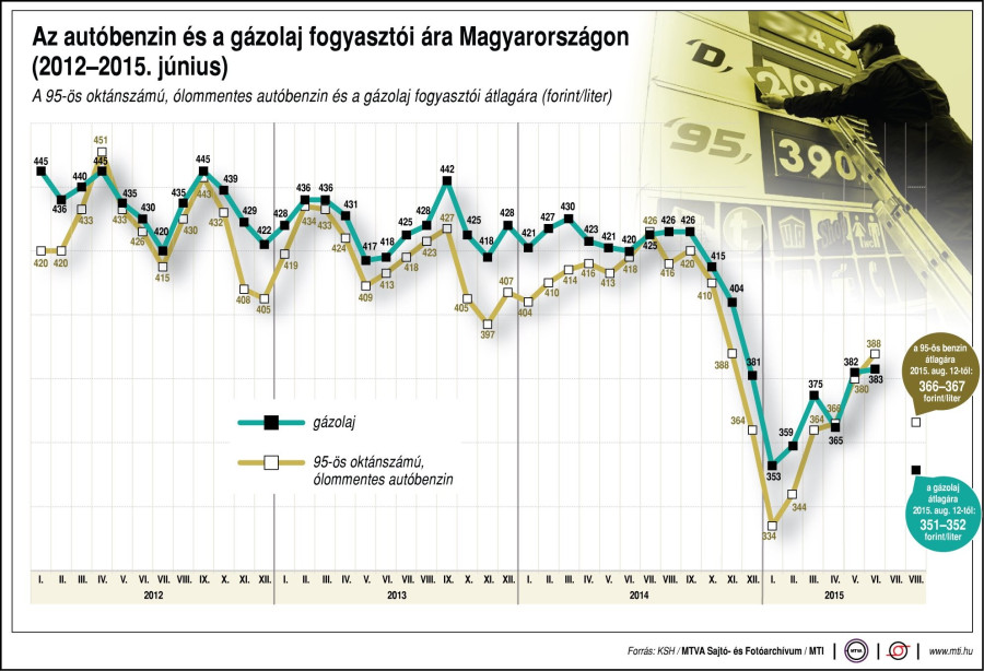 A benzin literenkénti átlagára tavaly szeptember és 2015. január között mintegy 100 forinttal csökkent, majd idén július közepéig fokozatosan több mint 70 forinttal emelkedett. Az utóbbi csaknem egy hónapban viszont 30 forinttal ismét csökkent a benzin ára. A gázolaj literenkénti nagykereskedelmi ára február eleje óta csaknem 30 forinttal lett magasabb, az utóbbi három hétben viszont már csaknem 20 forinttal csökkent.
