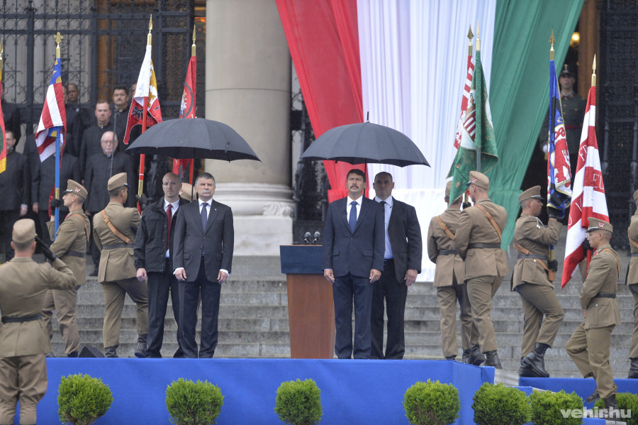 A központi ünnepi rendezvények nyitó eseménye esőben zajlott. Az ünnepségen részt vett Áder János köztársasági elnök, Kövér László, az Országgyűlés elnöke, a kormány több tagja, köztük Hende Csaba honvédelmi miniszter, valamint közéleti személyiségek, a diplomáciai testület tagjai és katonai attasék. A lobogó felvonása után honvédtisztjelöltek teszik le katonai esküjüket. Az érdeklődőket katonai bemutatókkal és zenével várják a Kossuth térre.