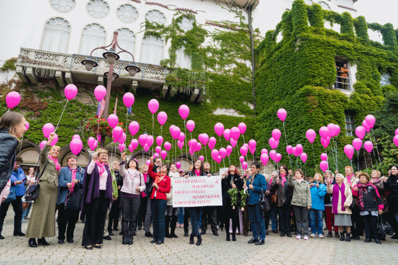A rózsaszín lufik felengedése. A séta utolsó állomásán, a Petőfi Színház előtt engedték fel a ballonokat. Bent meglepetésműsor, ingyenes szűrővizsgálat és véradás várta a hölgyeket.