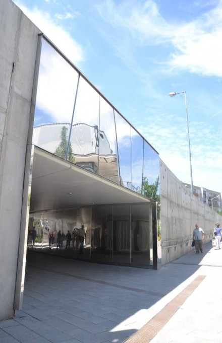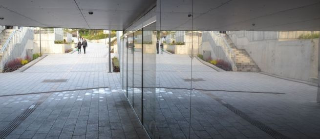 A forgalmi viszonyok tisztázása érdekében a gyalogos közlekedés egyértelműen az aluljáróba terelődött. Most lejtőssé alakított utcán érhetjük el az aluljárót, és ugyanilyen módon tudunk feljönni belőle. A süllyesztett utcarészt széles lépcsők és növényekkel beültetett felfelé nyíló rézsűk határolják, amelyek oldják a zárt oldalfalakat, barátságos és egyben határozott rávezetést biztosítanak az aluljáróra mindkét irányból. Az aluljáró belső tükröződő burkolata növeli az átláthatóságot és optikailag a teret is, ráadásul a szomszédos nyers beton támfalakra is kihajlik. Ezek a támfalak helyet adnak a vendéglátó egységek teraszainak illetve a pavilonoknak is. Az építészek egységes megjelenésű, ugyanakkor változatos formájú pavilon- és teraszrendszert terveztek, amelyek közül eddig egy információs pavilon valósult meg. A látszóbeton támfalakon lévő acél korlátok a vasbeton szerkezetek síkja elé kerültek, növény futtató rácsokkal integrálva a kúszó növényekkel együtt egy másodlagos, plasztikus zöld térfal-rendszert képeznek.