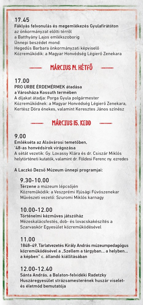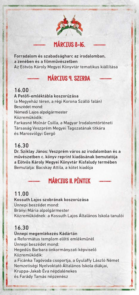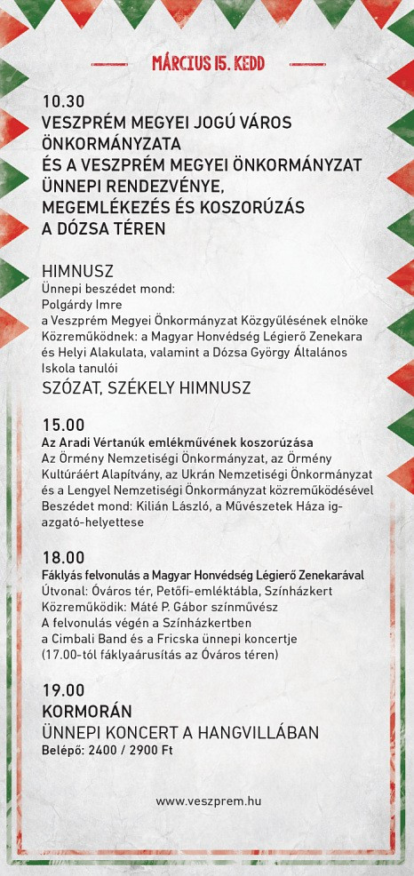 Megnyílik a Csodakert: november 30-tól minden vasárnap adventi programok várják a közönséget közélet Megnyílik a Csodakert: november 30-tól minden vasárnap adventi programok várják a közönséget November 30-án, 16:30-kor ünnepélyesen megnyílik a Veszprémi Petőfi Színház előtti téren kialakított Csodakert, amely különleges hangulattal és vasárnaponkénti műsorokkal várja az érdeklődőket. A kert mindennap látogatható lesz az előadások végéig, akár késő estig, és számos pihenőpontot, fotóhelyszínt, valamint a színház számára készített betlehemet is megtekinthetnek, átélhetnek a látogatók. 2025. november 26. 10:53 Nemzeti összetartozás napja: a magyarságtudatot nem lehet megtörni közélet Nemzeti összetartozás napja: a magyarságtudatot nem lehet megtörni Június negyedikén, fél öt után két perccel kezdődött meg az Óváros téren az első világháborút lezáró trianoni békediktátum aláírásának 105. évfordulójáról szóló megemlékezés. 2025. június 5. 11:23 Verancsics Faustusra emlékeztek közélet Verancsics Faustusra emlékeztek Csütörtök délelőtt ünnepélyes keretek között emlékeztek és tisztelegtek Verancsics Faustus emléktáblája előtt, melyről Abonyi János, a Pannon Egyetem rektora úgy fogalmazott, nem csupán egy történelmi emlék, hanem a város Európa szívéhez való szoros kötődésének és innováció iránti elkötelezettségének szimbóluma. 2025. április 24. 23:51
