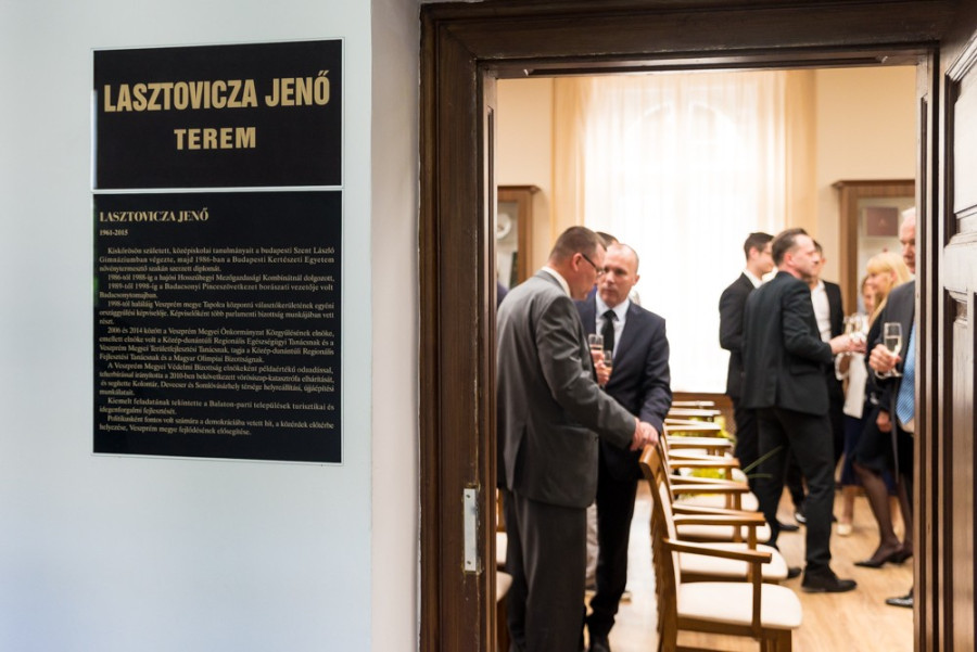 A megyeháza életében hagyomány, hogy az egyes konferenciatermeket egy-egy jeles személyről nevezik el - a választás ez esetben Lasztovicza Jenőre esett, aki két évtizedig alkotott és dolgozott az épületben, s 2006-tól 2014-ig a Veszprém Megyei Közgyűlés elnöke volt. „Nála méltóbb névadót nem találhatunk, így tisztelgünk egy kiváló, a hazáját és a közt önzetlenül szolgáló ember munkája előtt” – mondta el Takács, majd a jelenlévők egy rövid filmes összeállítást is megnézhettek az egykori elnökről.
