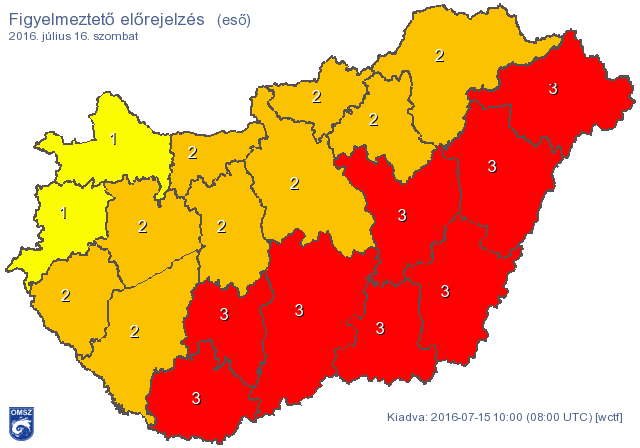 Az ország déli és keleti régiói rosszabbul jártak: a figyelmeztetés szerint itt akár 50 mm-t meghaladó csapadék is lehet szombaton, ez majdnem a júliusban szokásos teljes havi csapadékmennyiség. Az OMSZ figyelmeztetésében hozzátették, hogy helyenként akár 80 mm eső is hullhat.