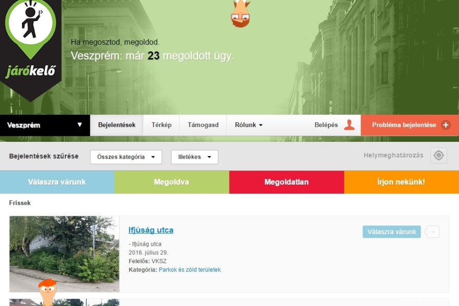 A Járókelő Egyesület tíz magyarországi városban szolgáltatja az informatikai felületet ahhoz, hogy a lehető leggördülékenyebb legyen a problémás közterületi ügyek intézése. Veszprém csatlakozása révén a Közüzemi Szolgáltató vezetésével, a Bakonykarszt, az E.ON-n, a MÁV, a Városüzemeltetési Iroda, a rendőrség, a közútkezelő, a jegyzői hivatal és számos civil szervezet képes hatékony közreműködést folytatni. – Mindenki pozitívan állt a kezdeményezéshez, s az eredmények már most azt mutatják, hogy érdemes volt belevágni a fejlesztésbe – húzta alá dr. Temesvári Balázs, aki a több tucatnyi parkolóhely felszabadítását nevezte a program eddigi legnagyobb sikerének.