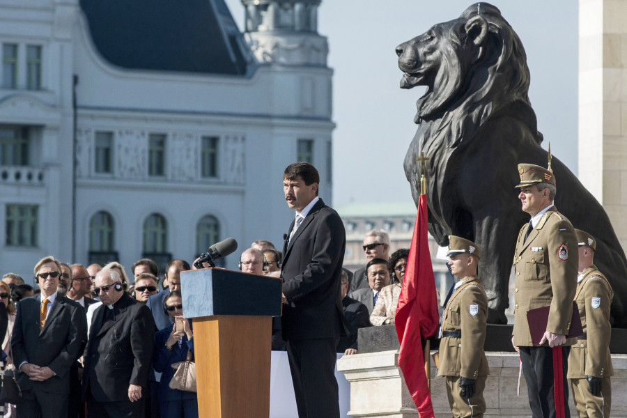 Az államfő az Országház előtti Kossuth téren esküt tett katonákhoz is szólva úgy fogalmazott ünnepi beszédében, "mi ma is Szent István népe vagyunk, egy sokszínű nemzet, amely oly sokszor a maga erejéből forgatta a történelem kerekét". "Forradalmak, neves és névtelen hősök népe, a meghurcoltaké, a kitaszítottaké, az üldözötteké, a csökönyös újrakezdőké, a hittel teli újjáépítőké, a szabadságához mindenáron ragaszkodóké" - mondta.