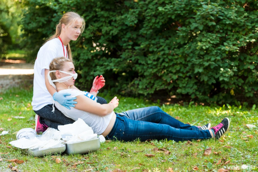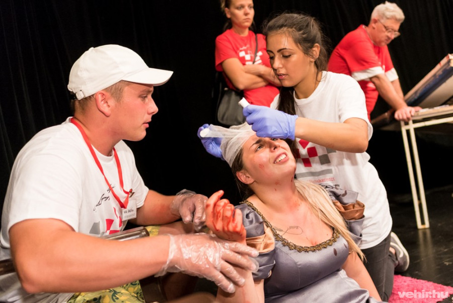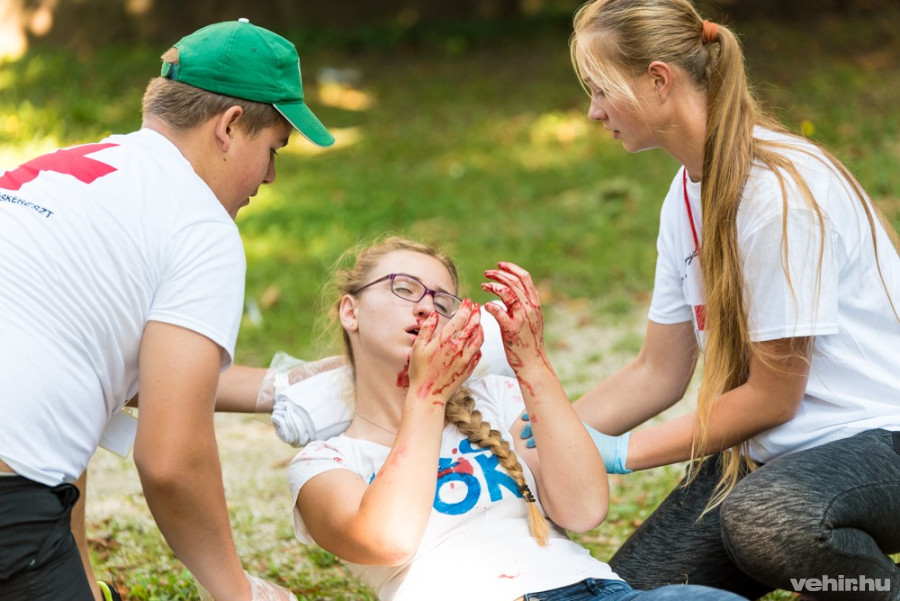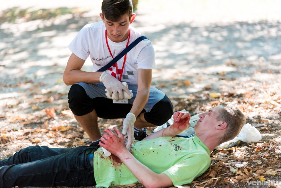 Szerencsére hamar érkezett a felkészült segítség, akik gondosan ellátták a sebesülteket. Valójában persze a szerencsének ehhez semmi köze, a Vöröskereszt zászlaja alatt vonuló csapat nem véletlenül tévedt a helyszínre, és az első pillanatban ijesztőnek tűnő helyzet sem valós: az Országos Elsősegélynyújtó Verseny döntőjének húsz állomása közül tévedtünk az egyikre.