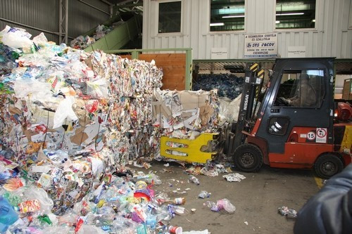 előtérben a tömörítésre váró műanyag palackok, hátrébb a bálázott papír