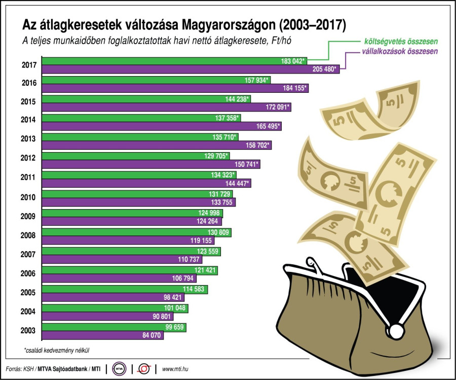 A minimálbérrel együtt az átlagos fizetések is emelkedtek: míg 2010-ben a KSH adatai szerint a versenyszférában 133 755 Ft volt az átlagos kereset, tavaly ez az összeg már 205 480 forint volt.