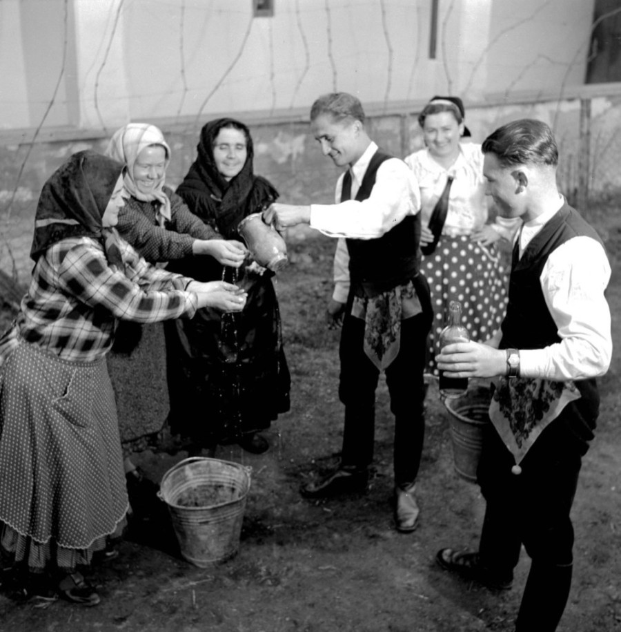 Miskén a locsolólegények az idősebb asszonyoknak a kezükbe öntötték vizet /Fotó: Miske, 1955. április 10. Magyar Fotó: Tormai Andor