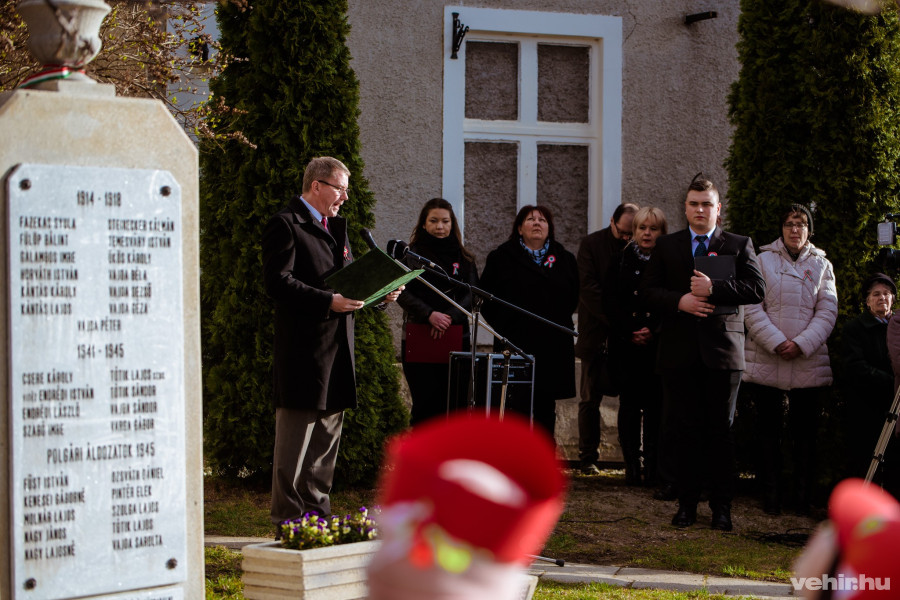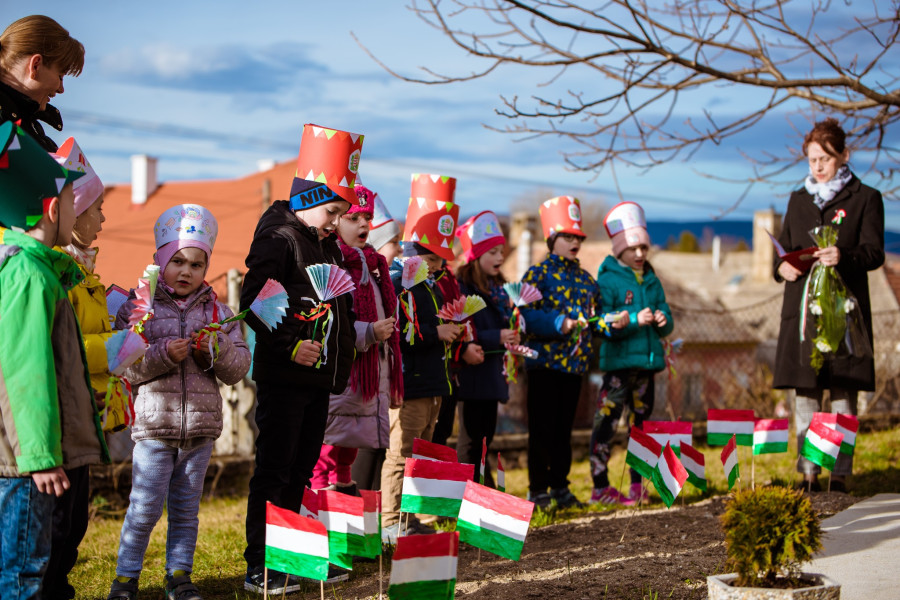 A megemlékezésen a Ficánka óvoda csemetéi adtak elő 1848-as dalokat és verseket, a résztvevők pedig elhelyezték virágaikat a hősi emlékműnél a templomkertben.