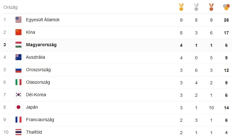 A riói olimpia összesített éremtáblázata a keddi versenynap után: