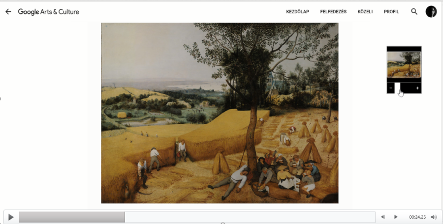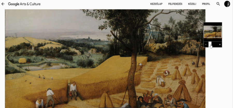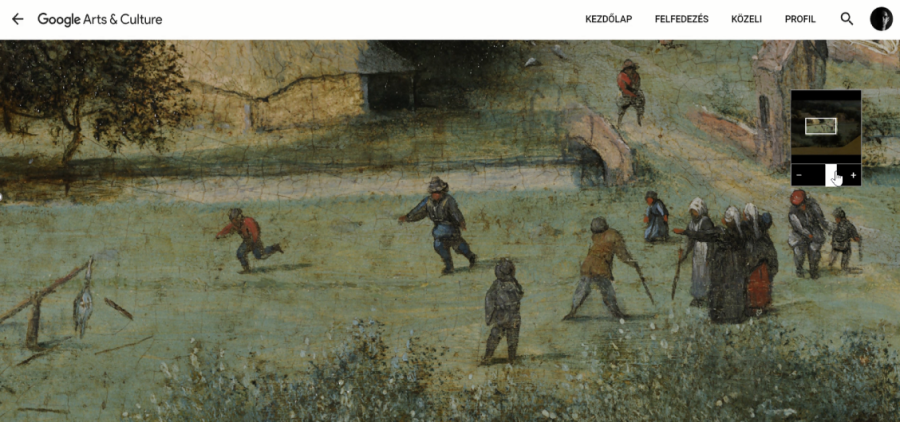 A különlegessége a platformon található képeknek, hogy a fényképezési technológiát úgynevezett gigapixelnek nevezik. Ez kép közel 10 milliárd pixel, de mit is jelent ez? A zoomolásnál láthatjuk, hogy a minősége elképesztő. Ahogy nézzük a képet, közelítünk, kinagyítjuk és találunk itt valamit. Nézzük a festmény apró részletét, és láthatjuk, hogy ezek a gyerekek valójában ütnek valamit. Utána jártam, hogy mi is történik itt, megtudtam, hogy ez egy játék, amiben egy libát vernek botokkal húshagyókedden, és állítólag abban a korban ez nagyon népszerű volt. Ahogyan még inkább közelítünk láthatjuk, a hajszálrepedéseket, az ecsetvonásokat.