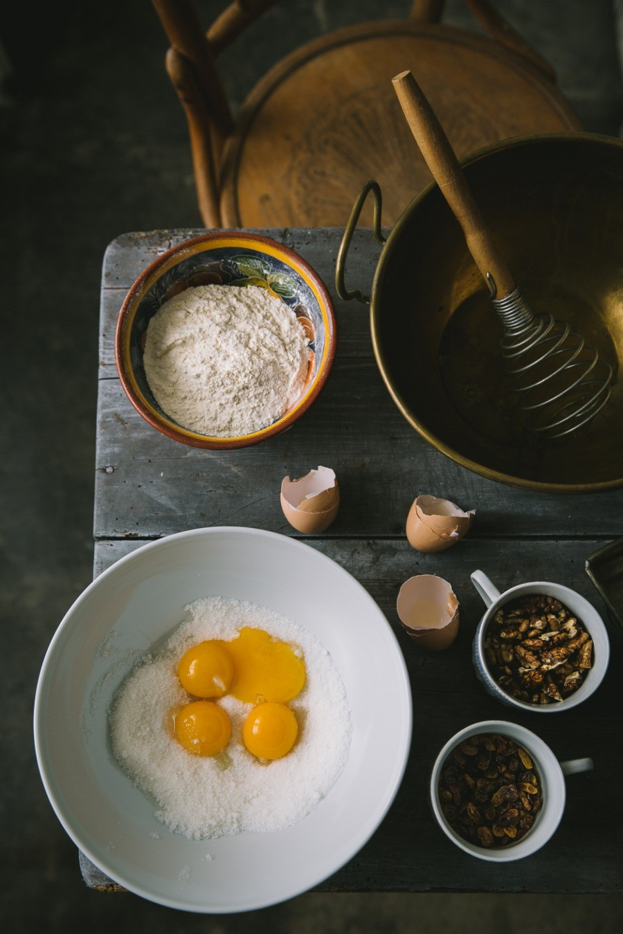 A legelső recept, amit kipróbáltam ebből az azóta is nagy becsben tartott kincsből, a püspökkenyér volt, amelynek szűkszavú leírását 89 éves nagymamám segítségével fejtettük meg. Mami rögtön tudta, hogy a “4.t” és a “6 t.” a recept négy- és hat tojásos változatát jelenti, sőt, rögtön kölcsönadta a négytojásos recept méretének megfelelő őzgerinc formáját. Mami javaslatára – és a párom kedvéért, aki nagy csoki rajongó – annyit módosítottam az eredeti verzión, hogy a mazsolán és a dión kívül étcsokoládét is kevertem hozzá, de pontosan az a csodálatos ebben a receptben, hogy nem kell hozzá különleges hozzávaló, és szabadon változtatható annak megfelelően, hogy mi van éppen otthon. Dió helyett kerülhet bele mandula, mazsola helyett bármilyen aszalt gyümölcs, a csoki pedig szabadon el is hagyható (bár halkan megjegyzem, hogy nem javaslom). A végeredmény egy csodálatos édesség lesz, akár desszertként, akár a délutáni kávé mellé tálaljuk fel.