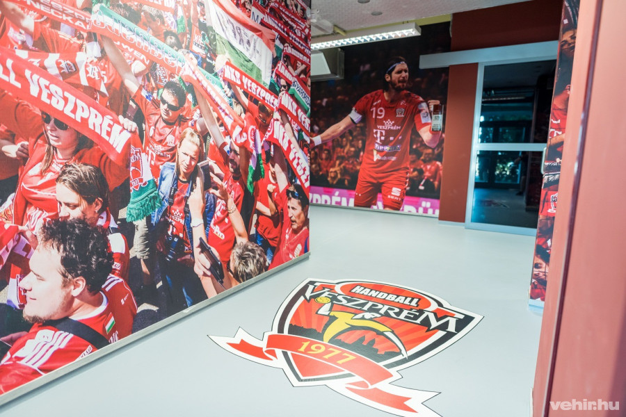 Mindemellett a teljes öltöző folyosót is felújították: felcsiszolták a műpadlót, amely nemcsak új színt kapott, hanem műgyanta segítségével három darab Telekom Veszprémes logót is ráfestettek.
