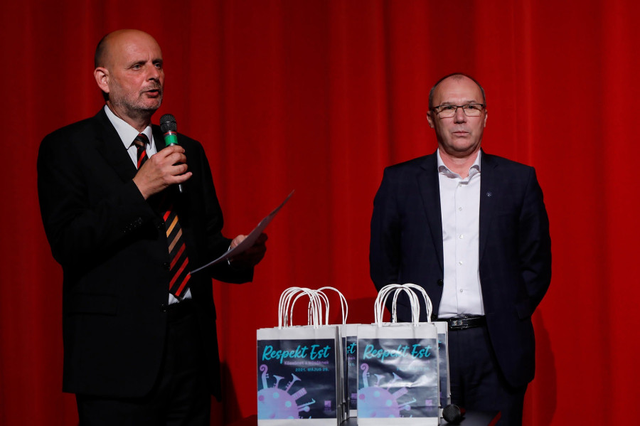 Az este folyamán elismeréseket is átadtak olyan dolgozóknak, akik ajánlások alapján még a többi „hős” közül is kitűntek. Ezeket Bélafi László, valamint Porga Gyula, polgármester adták át a színpadon. Utóbbi rövid köszöntőjében kiemelte, a járvány olyan új szavakat tanított meg mindenkinek, mint például a pandémia, de akadtak olyan fogalmak is, amelyek ennek hatására új értelmet nyertek és az elfeledettségből ismét az előtérbe kerültek. Ilyen a közösség, a hivatástudat, az emberség. Ezt pedig azoknak az embereknek köszönhetjük, akik szombat este ott lehettek a Hangvillában, mondta Porga Gyula.