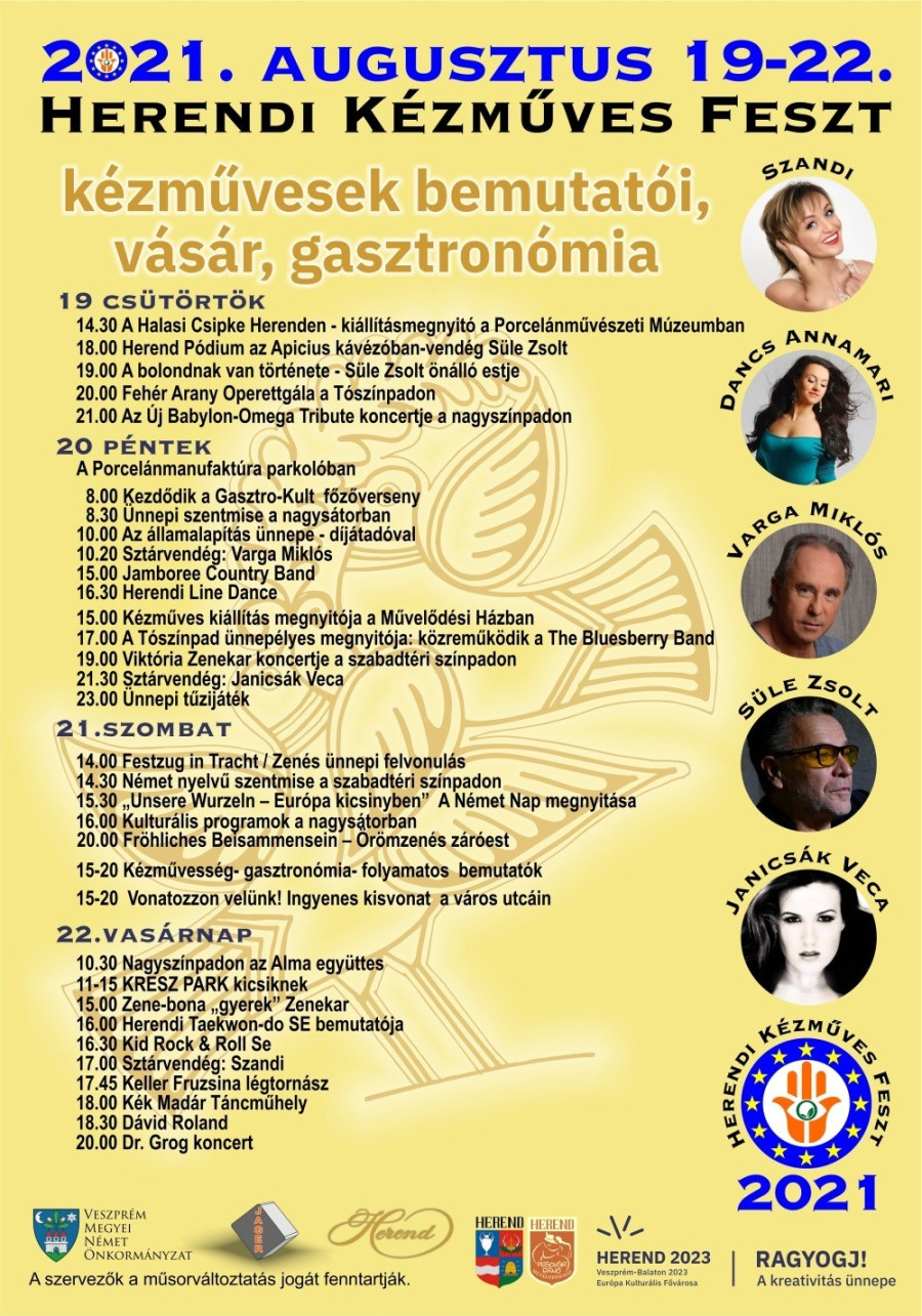 Ami a programot illeti, Mészáros Gabriella művelődésszervező úgy fogalmazott, egy négynapos örömünnepet álmodtak meg, amelyre több mint 30 kézművest várnak Herendről és a környék településeiről. A bemutatók mellett lehetőség lesz vásárolni a portékákból és arra is, hogy közösen alkossunk valamit a kézművesekkel.