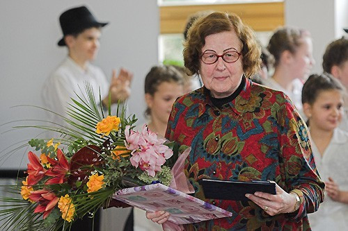 A Dózsa iskolában meghitt hangulatú ünnepséggel, német dalokkal, zenés műsorral köszöntötték Giza Berger tanárnőt, aki négy éve jár vissza több hétre tanítani az iskolába.