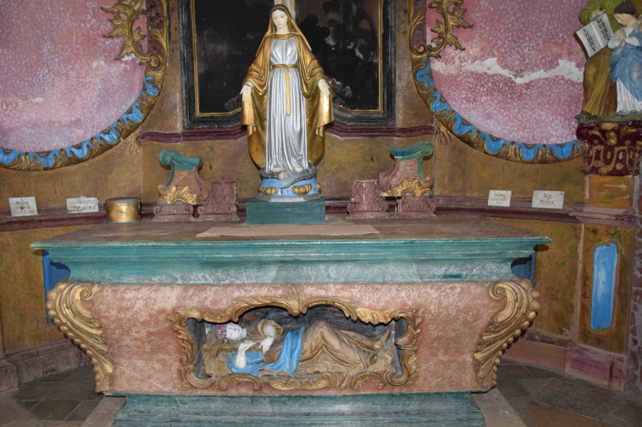 A szentélyben rokokó oltár áll. Az oltártömb előlapján kialakított barlangfülkében Szent Rozália szobrát láthatjuk. A szicíliai származású középkori szentet gyakorta ábrázolták barlangjában fekve, feszülettel a kezében. Az oltárasztalon egyszerű posztamensen felöltöztetett Mária-szobor áll földgömbön, melyet almába harapó kígyó fon körbe, Mária szeplőtelen szüzességének jelképeként. Az oltárépítmény közepén található az oltárkép architektúra megfeszített Jézus szoborral. Az oltárépítmény két oldalán jobb oldalon Mária és édesanyja, Szent Anna, bal oldalon férfi szent szobra látható. Az oltárt dicsfénnyel övezett Szentlélek galamb, fölötte felhőkkel és puttófejekkel övezett Atyaisten szobor zárja, aki bal kezében jogart tart, mellette földgömb, jobb kezével áldást oszt. A kápolna előtt egy durvamészkőből faragott, népies megfogalmazású, feltehetően a 19. század második felében felállított kereszt látható, amelynek talapzatáról egykori felirata sajnos lekopott. A feszület lábánál, a talapzaton Szűz Mária alakja áll.