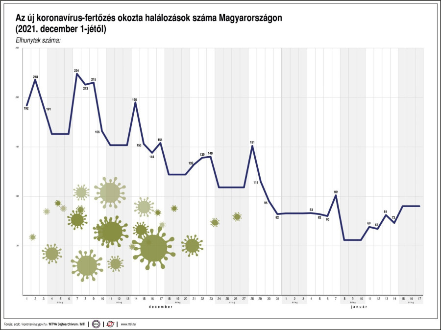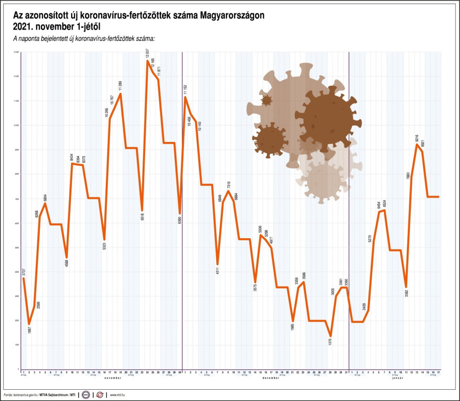 A beoltottak száma 6 319 434 fő, közülük 6 059 382 fő már a második, 3 417 089 fő pedig már a megerősítő harmadik oltását is felvette. Az elmúlt három napban 21 219 új fertőzöttet igazoltak, ezzel a járvány kezdete óta összesen 1 348 233 főre nőtt a beazonosított fertőzöttek száma. Az elmúlt három napban elhunyt 270 többségében idős, krónikus beteg, így az elhunytak száma 40 507 főre emelkedett. A gyógyultak száma folyamatosan nő, jelenleg 1 169 775 fő, az aktív fertőzöttek száma pedig 137 951 főre emelkedett. 2630 koronavírusos beteget ápolnak kórházban, közülük 228-an vannak lélegeztetőgépen.