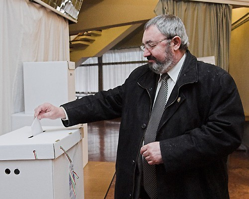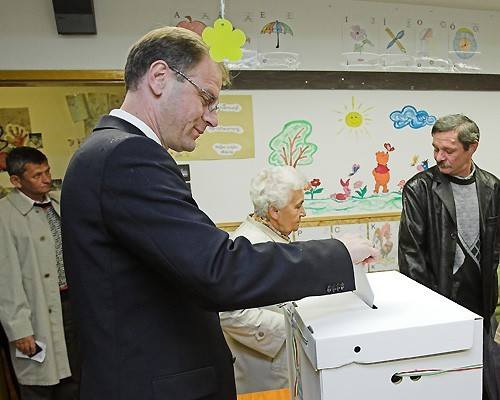 Debreczenyi János polgármester a feleségével érkezett és szavazott a Városi Művelődési Központban.