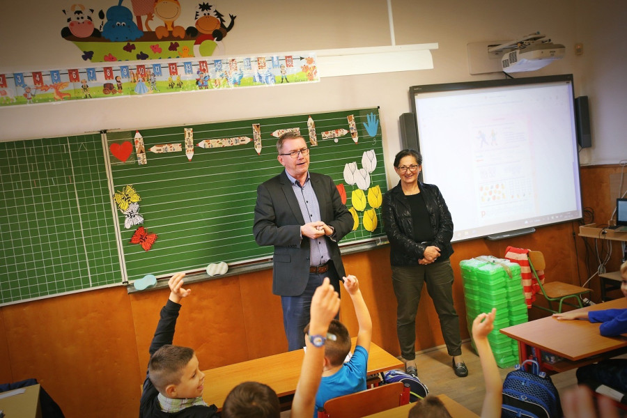 A Kossuth iskola elsőseinek Brányi Mária alpolgármester és Czaun János, a VHK nkft. ügyvezetője osztották ki a zöldszínű dobozokat – az intézményben 47 elsős vehette át az ajándékot.