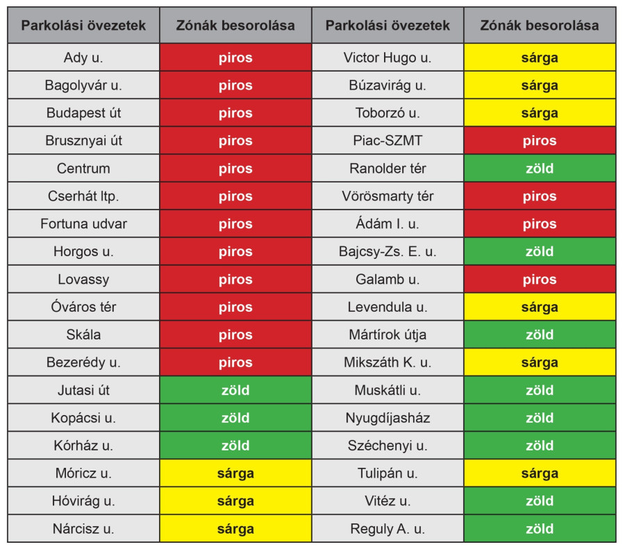 A Móricz, Hóvirág, Nárcisz, Victor Hugo, Búzavirág, valamint a belvárosban a Toborzó utca a sárga zónába kerülnek és munkanapokon 07.00-17.00 között él a díjfizetés időszaka.