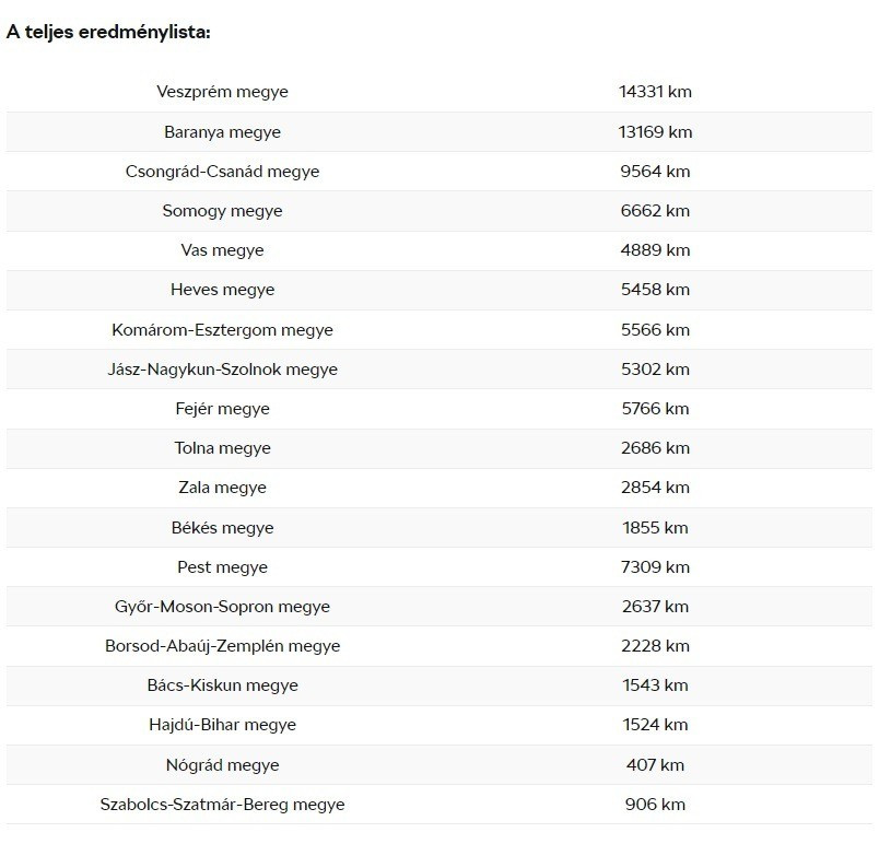 Érdemes megemlíteni azt a Jász-Nagykun-Szolnok megyei kerékpárost, aki egymaga majdnem 3000 kilométert tekert. Ez több mint a teljes táv fele, és így segítette a megyéjét az összesített lista 11. helyére.