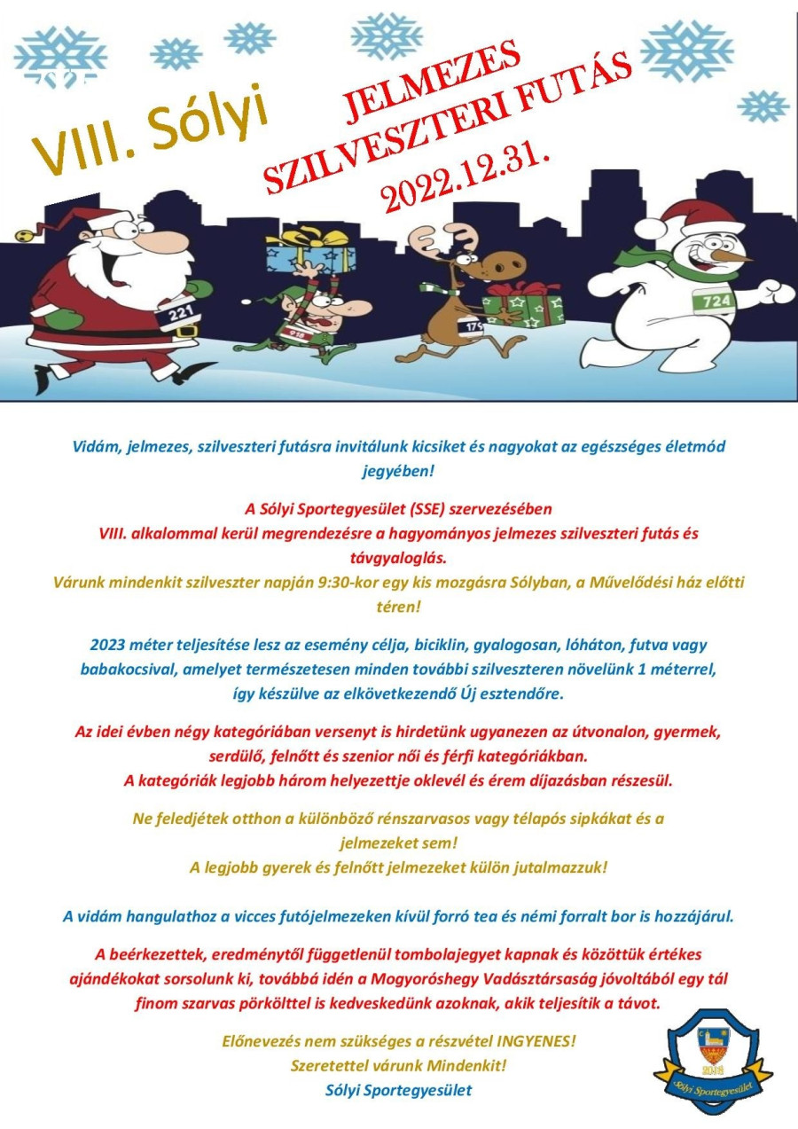 A Sólyi Sportegyesület szervezésében immáron nyolcadik alkalommal szervezik meg a hagyományos szilveszteri jelmezes futást a Veszprém melletti településen.